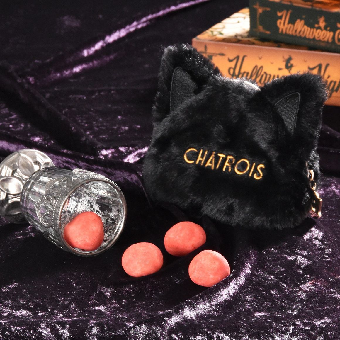 手触りの良い上質な素材に、ゴールドのロゴチャームがきらりと輝くシャトロワのオリジナルポーチ付き「子猫のポーチ黒(苺の牛乳ショコラ・ルージュ)」は、まるで猫の毛並みのようにふわっと優しい質感で、見た目も手触りも特別感たっぷり。