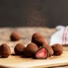 なめらかなミルクチョコレートで包み込み、仕上げに濃厚で香り高いココアをまぶしました。甘さ控えめにこだわり、苺の美味しさを引きたたせました